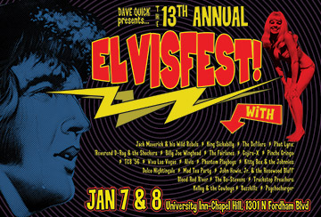 This poster was created for the annual Elvis Fest held in Chapel Hill, NC. We wanted to capture a bit of the naughty Elvis with this one — the tacky Velvet Elvis!