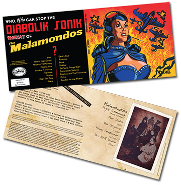 CD layout design for The Malamondos’ Diabolik Sonik CD. Agin, we wanted to fit in with their retro sound with an apporiate look.